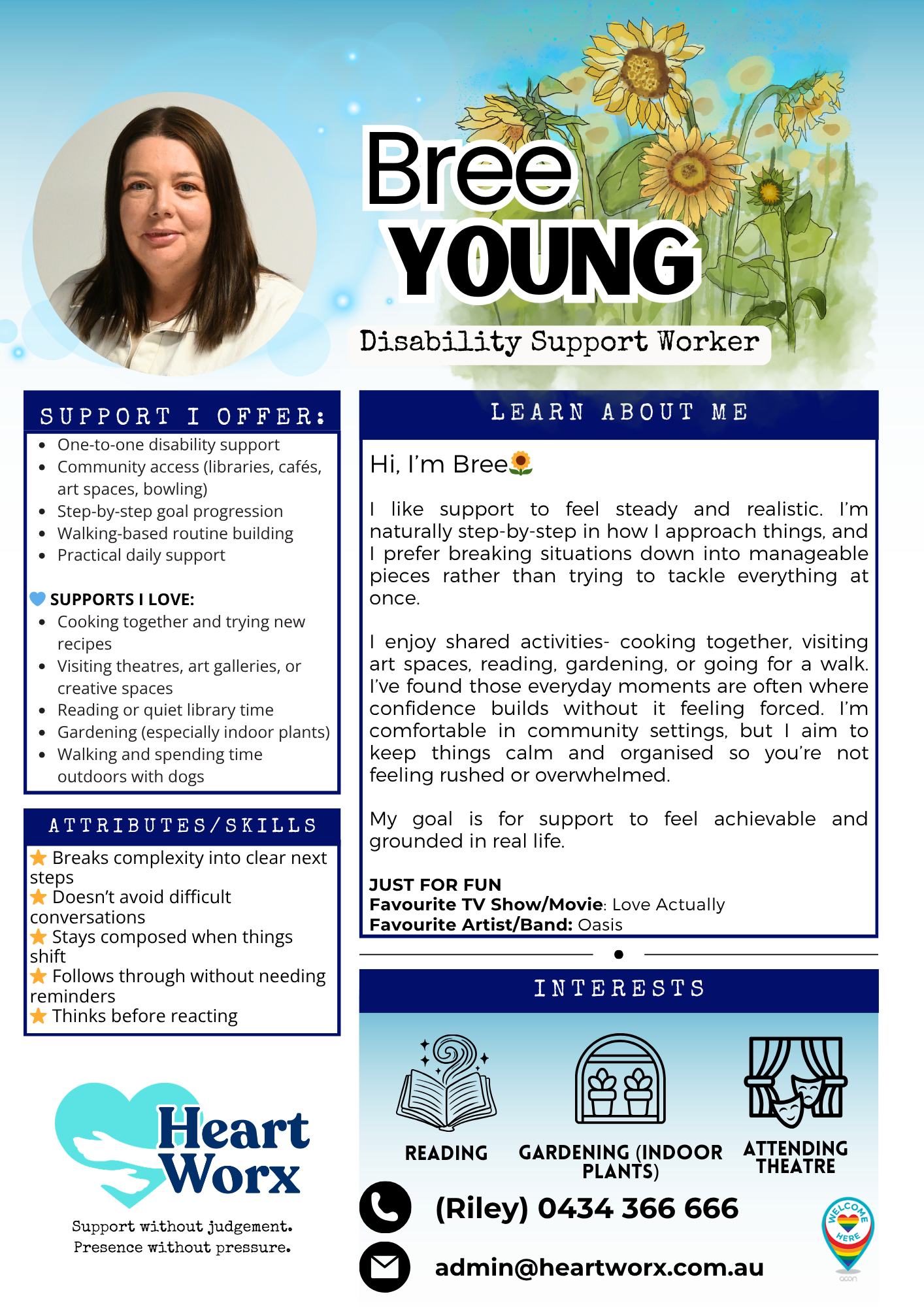 I enjoy shared activities—cooking together, visiting art spaces, reading, gardening, or going for a walk. I’ve found those everyday moments are often where confidence builds without it feeling forced. I’m comfortable in community settings, but I aim to keep things calm and organised so you’re not feeling rushed or overwhelmed.