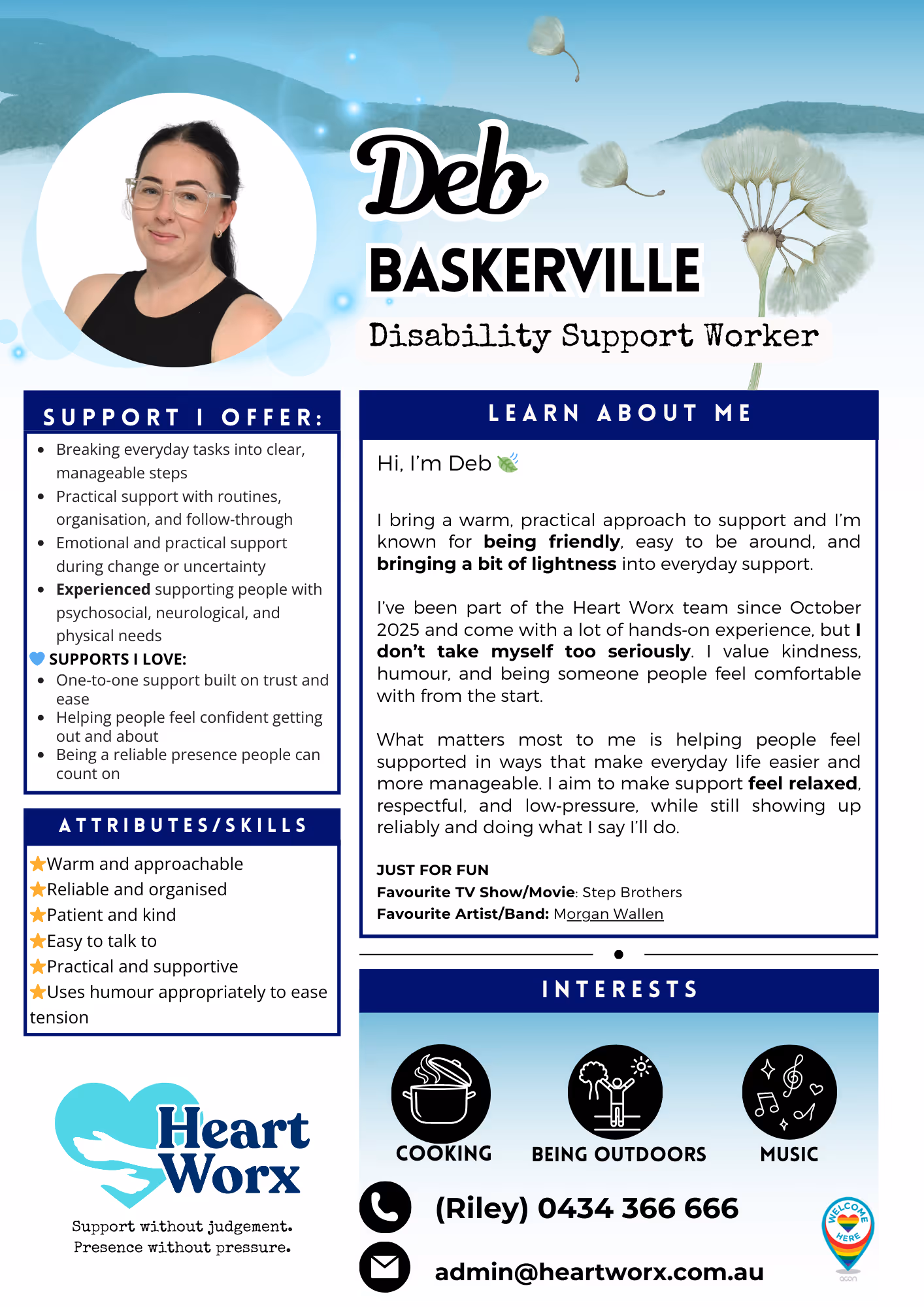I bring a warm, practical approach to support and I’m known for being friendly, easy to be around, and bringing a bit of lightness into everyday support.