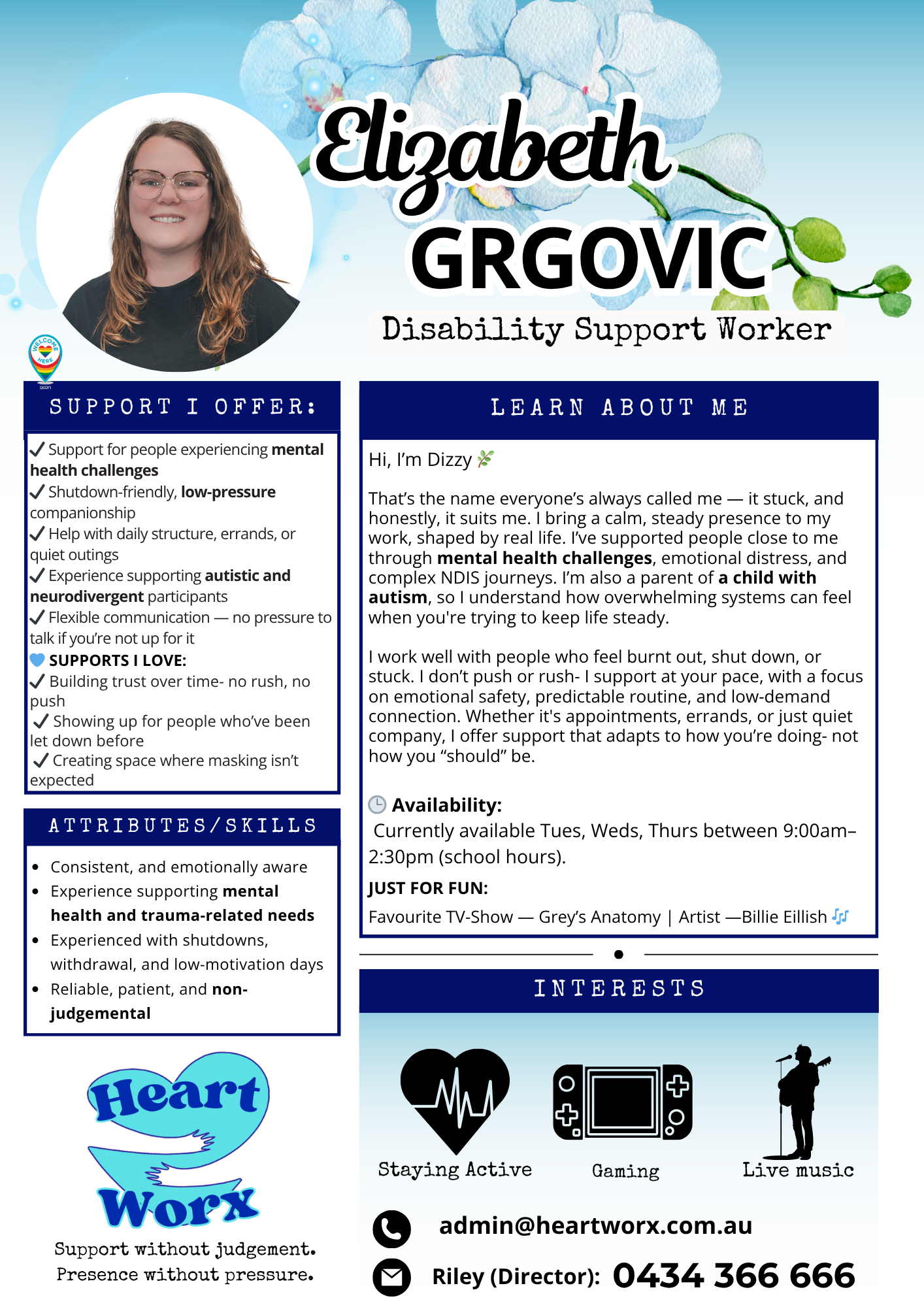 I’m Dizzy — calm, non-judgemental, and nerdy in the best way. I connect well with people who prefer low-pressure company, gaming sessions, or quiet outings. My focus is on creating safe, affirming spaces for autistic and neurodivergent folks.